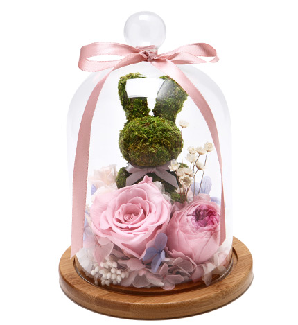 To温暖你心----苔藓小兔+粉色永生玫瑰+粉边紫心奥斯丁_特色永生花_永生花_乐惠鲜花商城